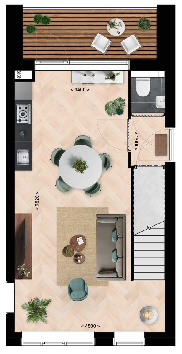 Op de eerste verdieping vind je achter de eigen voordeur een woonkeuken aan de achterzijde, compleet met een privé balkon, terwijl de woonkamer is gericht op het zuidwesten, perfect om te genieten van de avondzon.