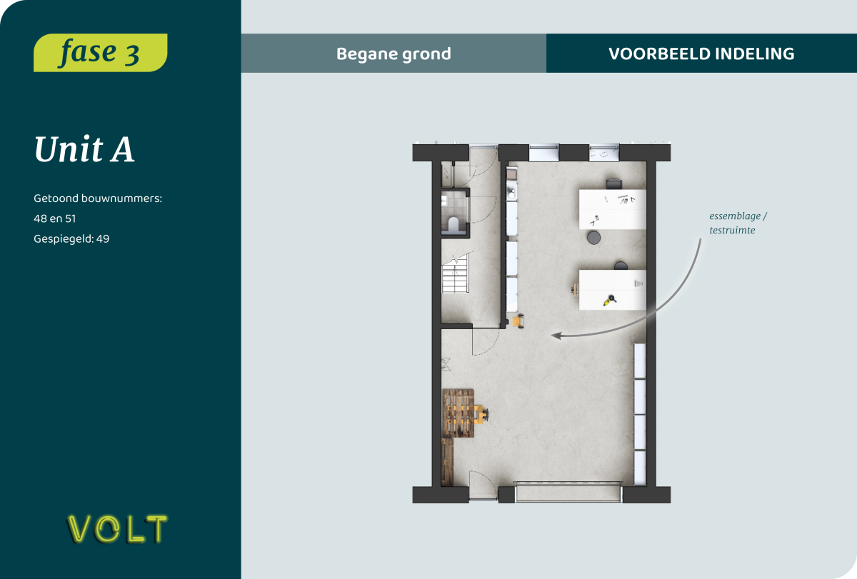 Het voorste deel van de begane grond biedt ruimte voor bijvoorbeeld een assemblage- of testruimte, bemonsteringstafels en opslag. Via de overheaddeur kan eenvoudig met een bedrijfsauto naar binnen worden gereden. De ruimte is flexibel in te delen en kan onder meer worden ingericht met inpaktafels en stellingen.
