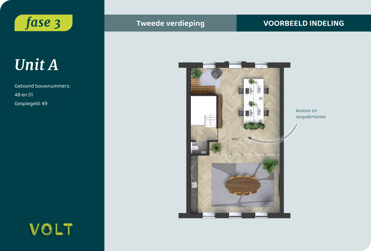 De tweede verdieping leent zich perfect voor een modern en ruim kantoor. De indeling biedt zowel werkplekken als een vergaderruimte, waar je klanten en collega’s professioneel kunt ontvangen. Dankzij de lichte en open opzet ontstaat een prettige werkomgeving die bijdraagt aan productiviteit én comfort.